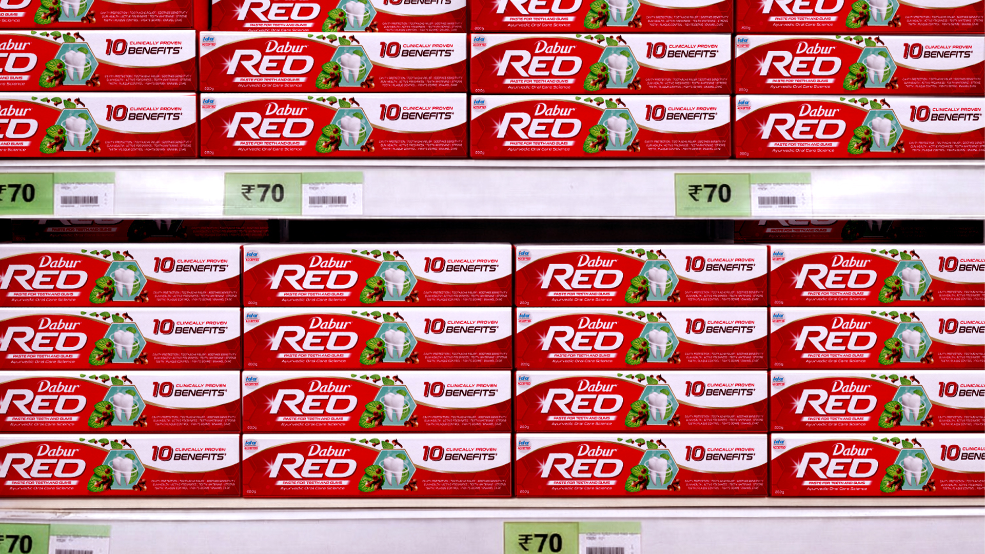 Symbolising harmony of Ayurveda & Science, the wave is our signature asset. Forming a tessellation across packs at shelf, it lifts brand confidence, elevates freshness, and creates a sea of ‘Red’, achieving striking impact in a competitive context.
